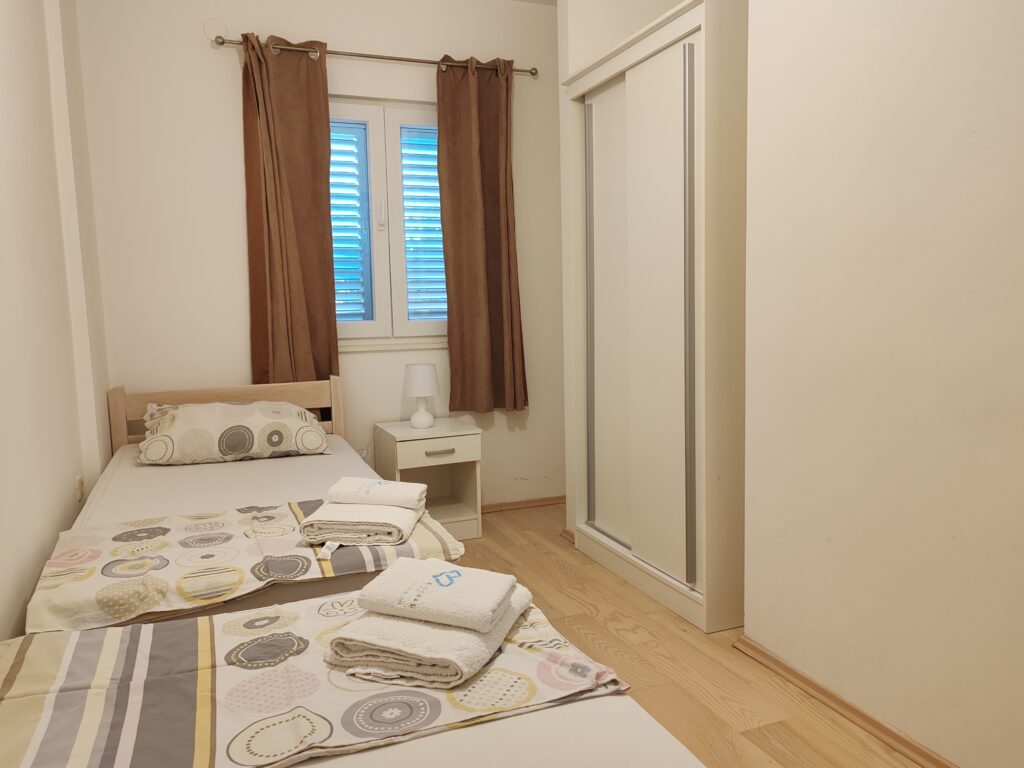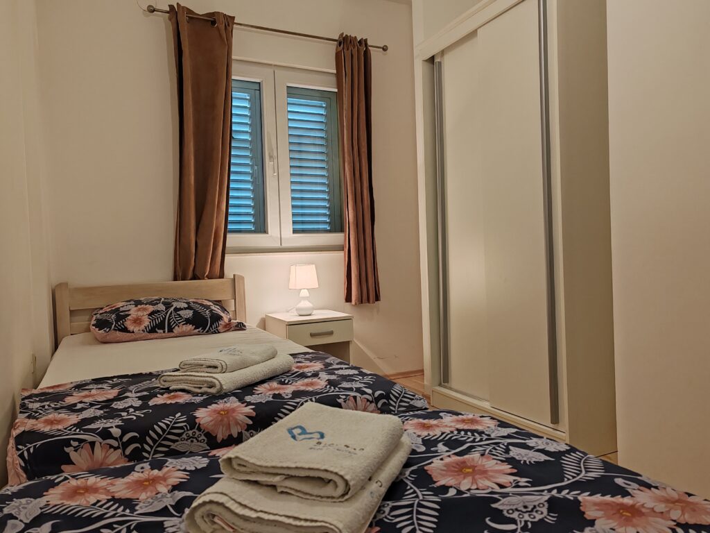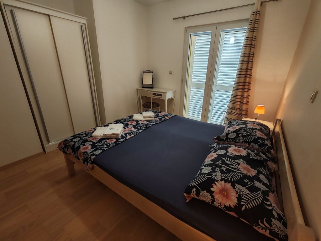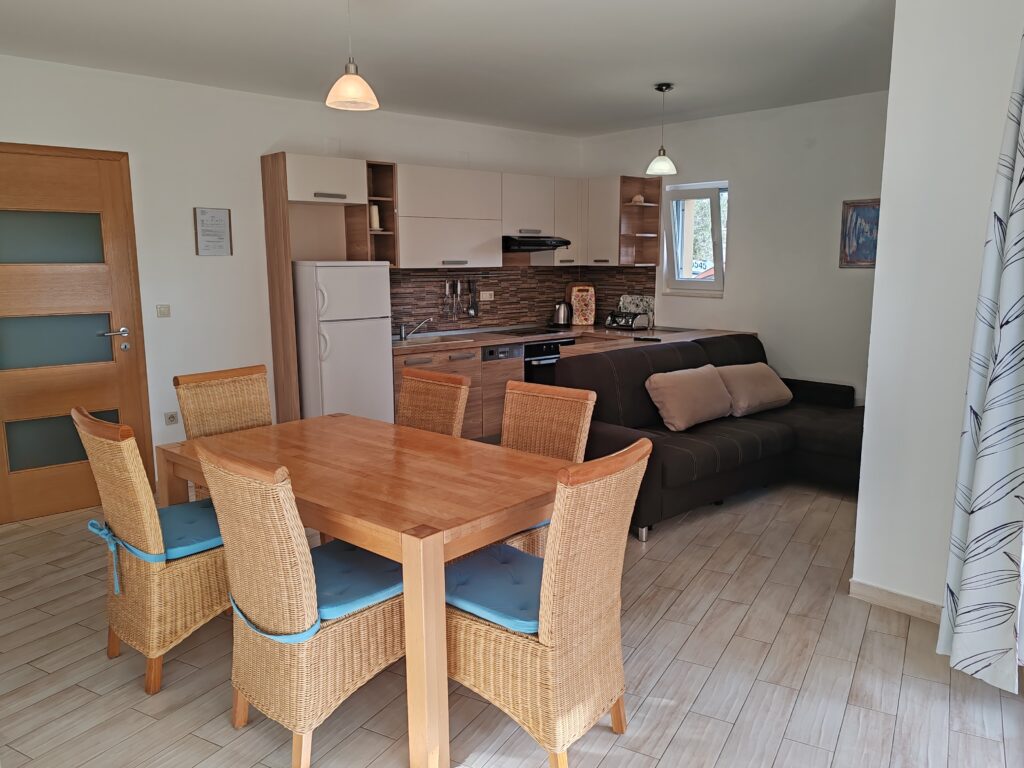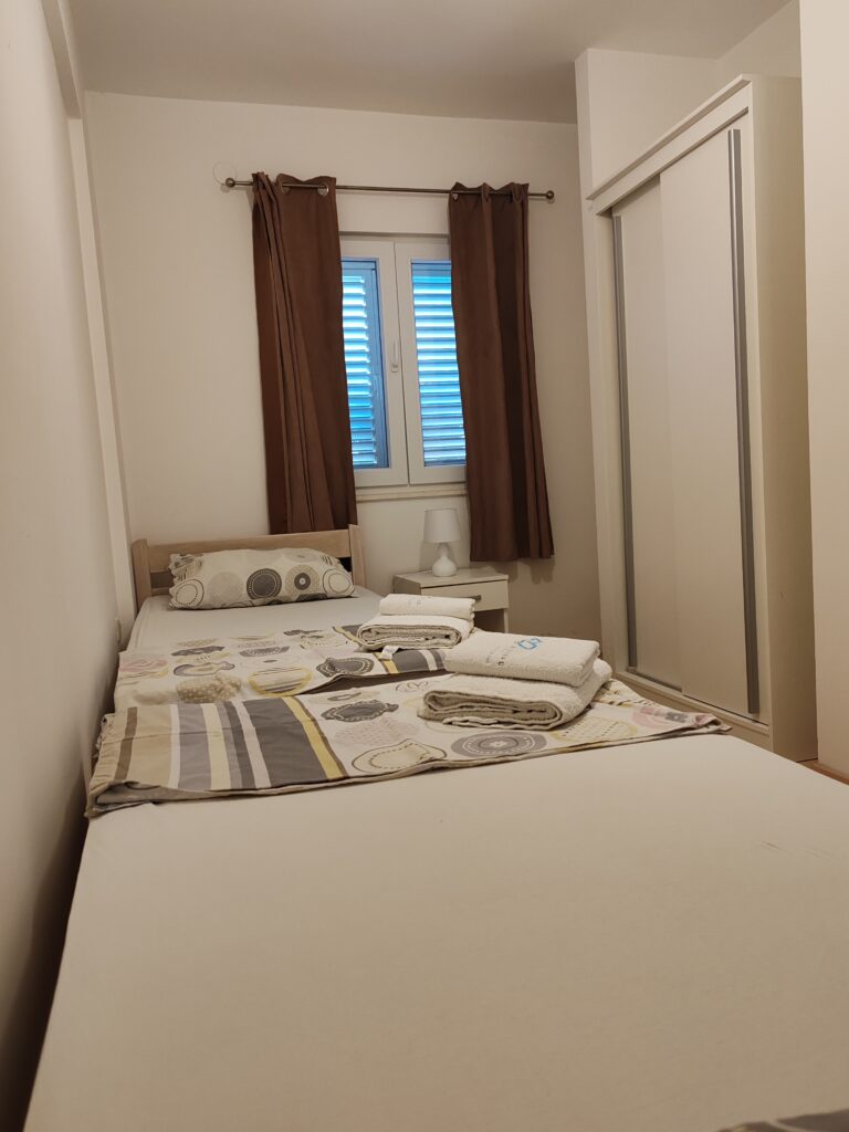 Located on the ground floor ( north) . Sizes 60 m2 with covered outdoor terrace.Consists of two separate rooms , one with a double bed and the other with two single beds.In kitchen there is a sofa bed / springbed.