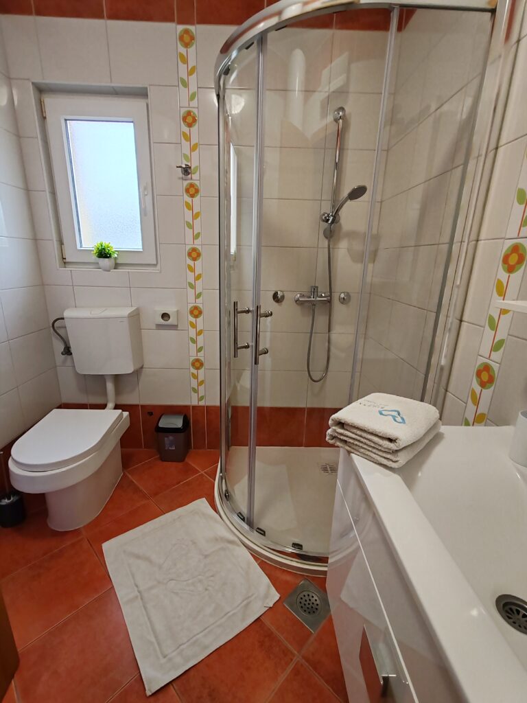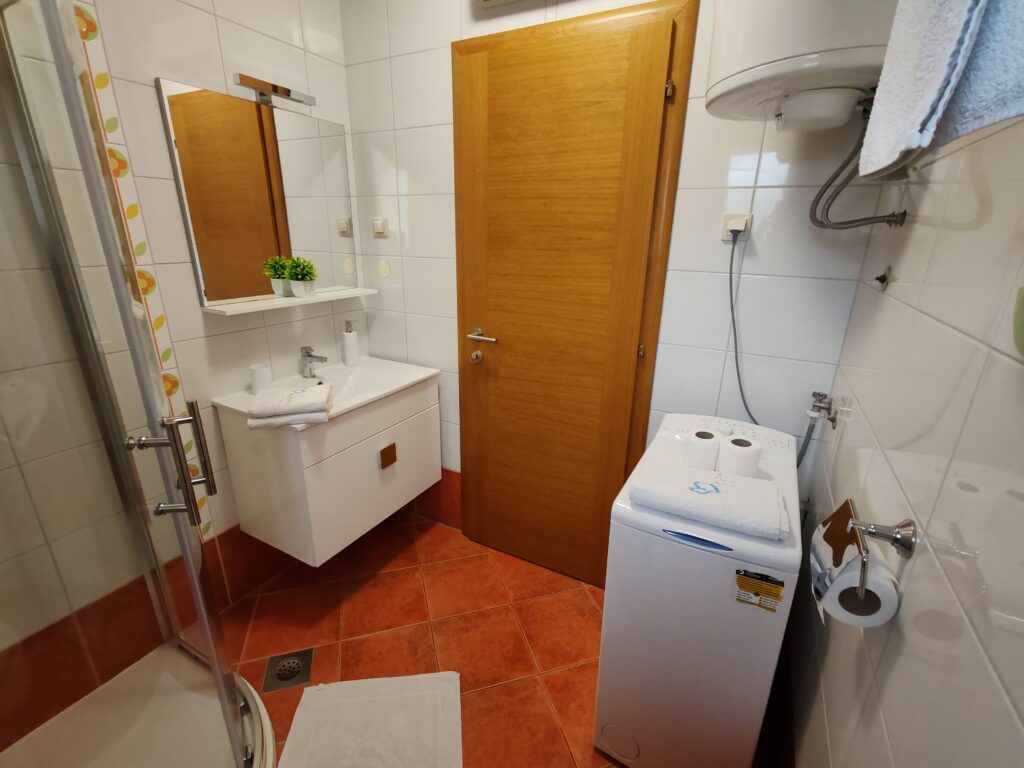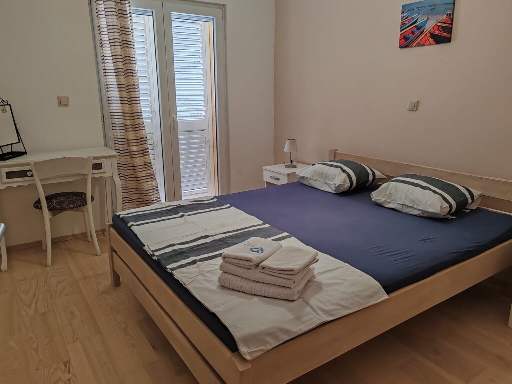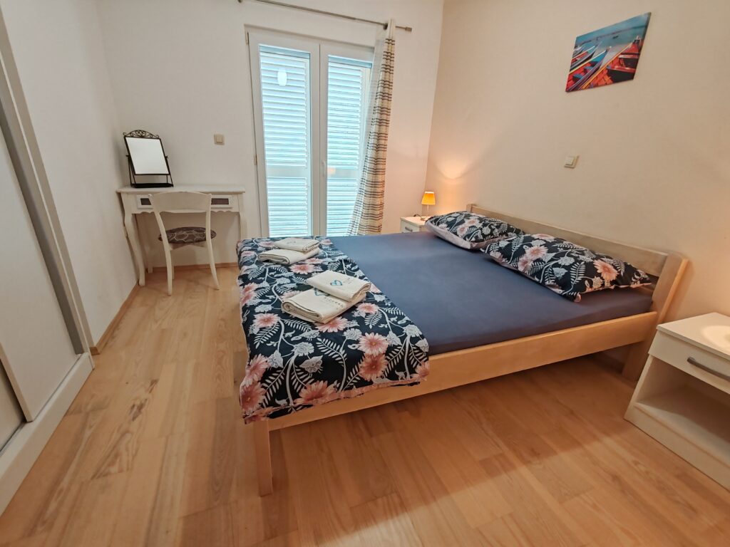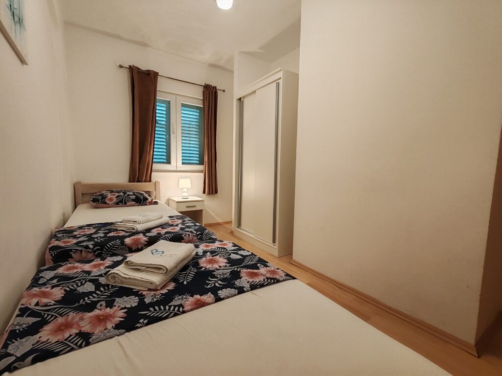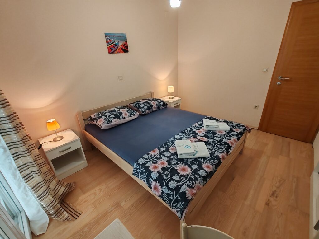 Located on the ground floor ( north) . Sizes 60 m2 with covered outdoor terrace.Consists of two separate rooms , one with a double bed and the other with two single beds.In kitchen there is a sofa bed / springbed.