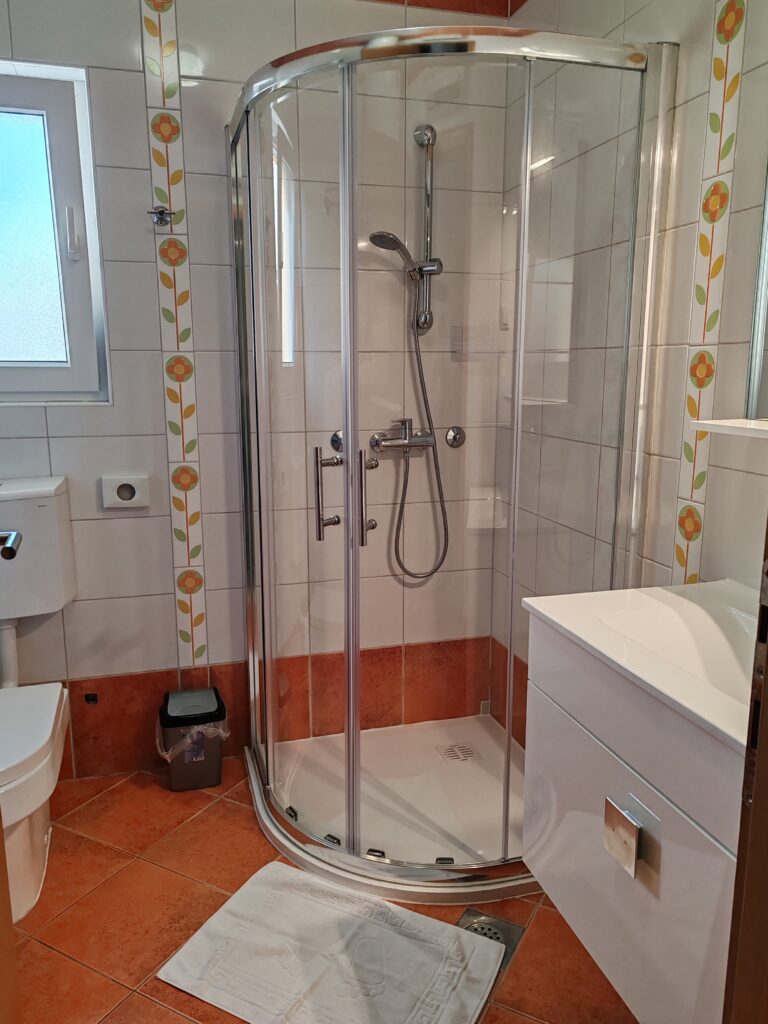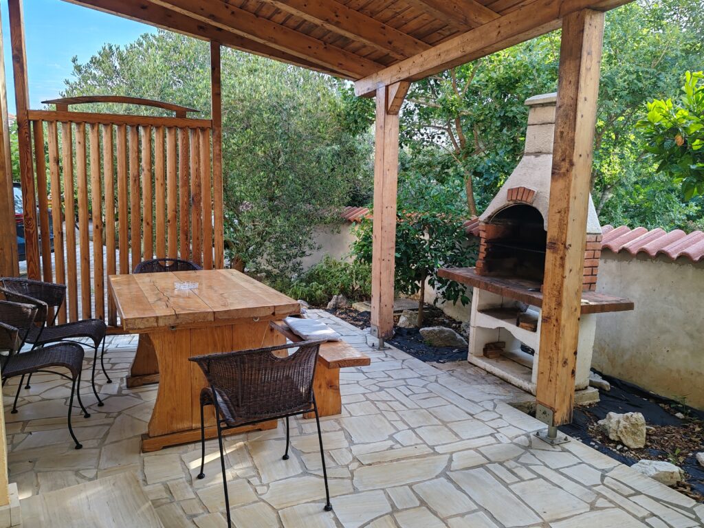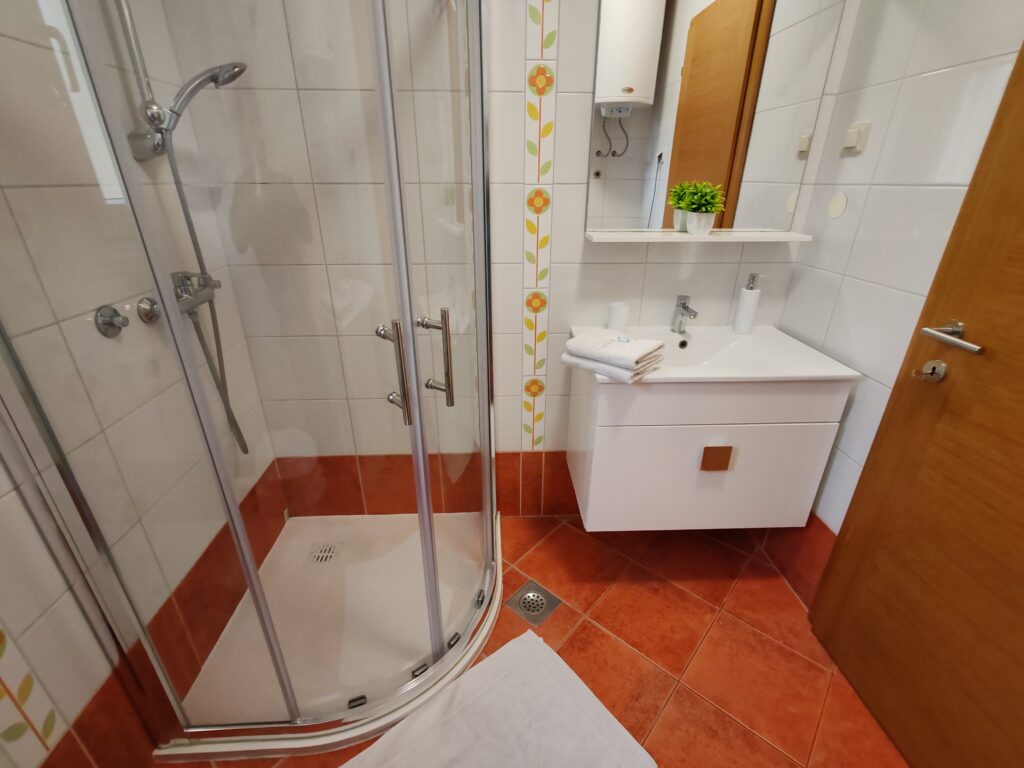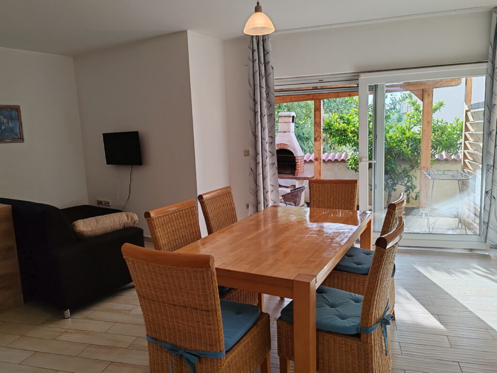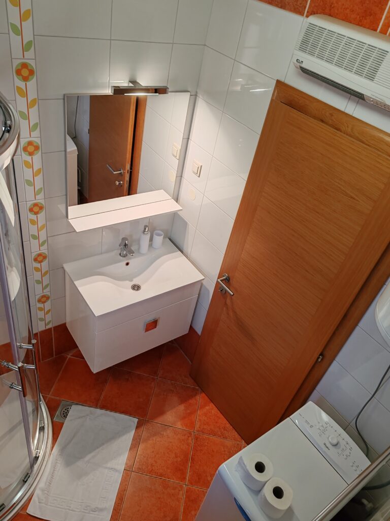 Located on the ground floor ( north) . Sizes 60 m2 with covered outdoor terrace.Consists of two separate rooms , one with a double bed and the other with two single beds.In kitchen there is a sofa bed / springbed.