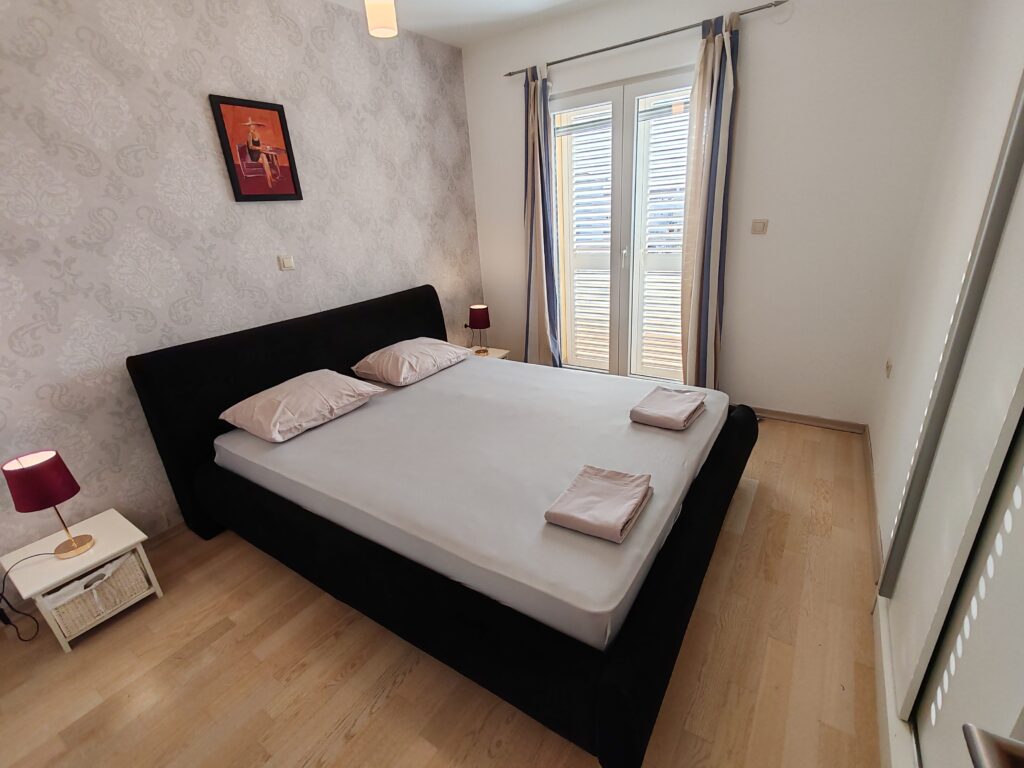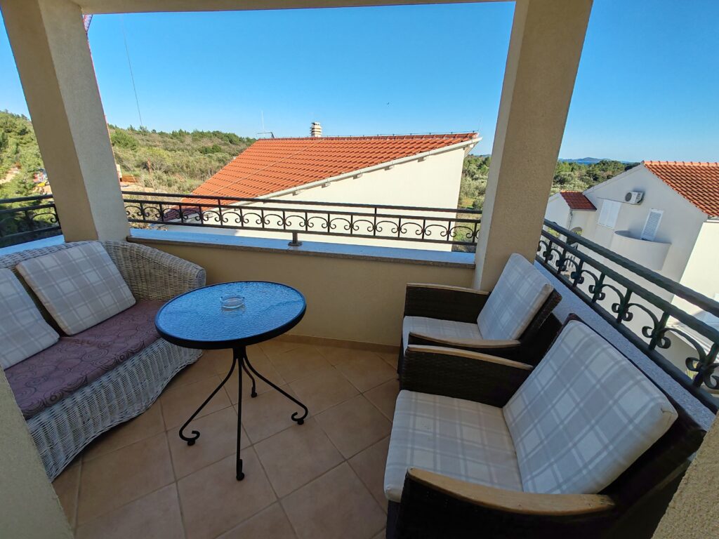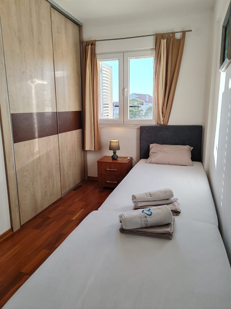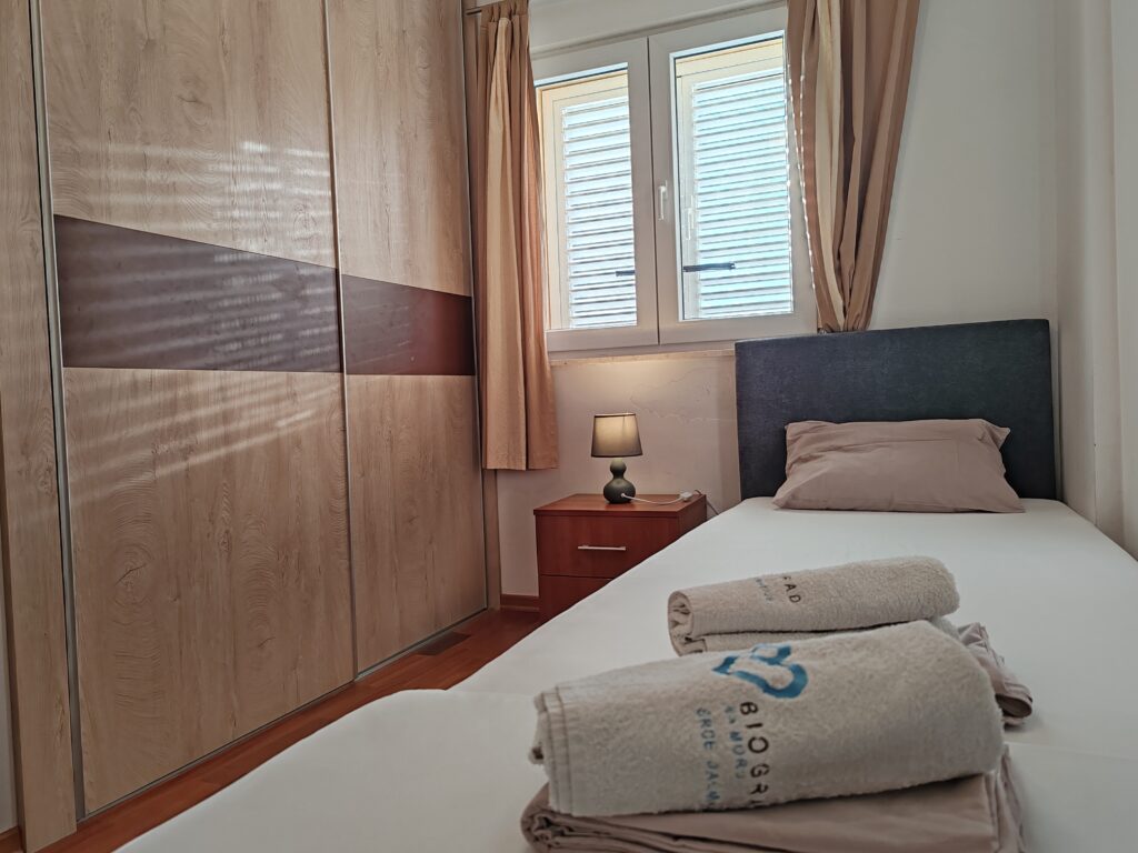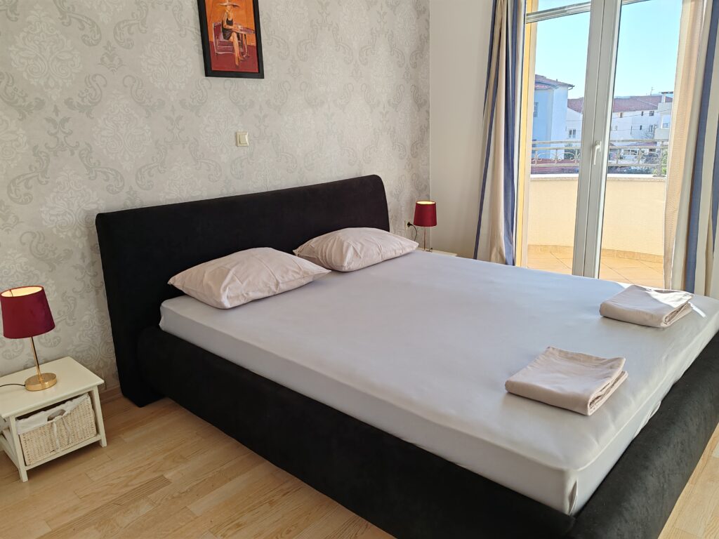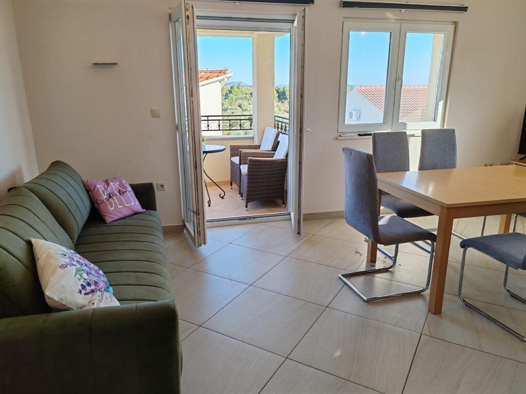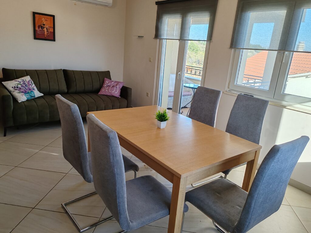 Located on the first floor ( south) . Sizes 60 m2 and a terrace overlooking the sea.Consists of two separate rooms , one with a double bed and the other with two single beds.In kitchen there is a sofa bed / springbed.