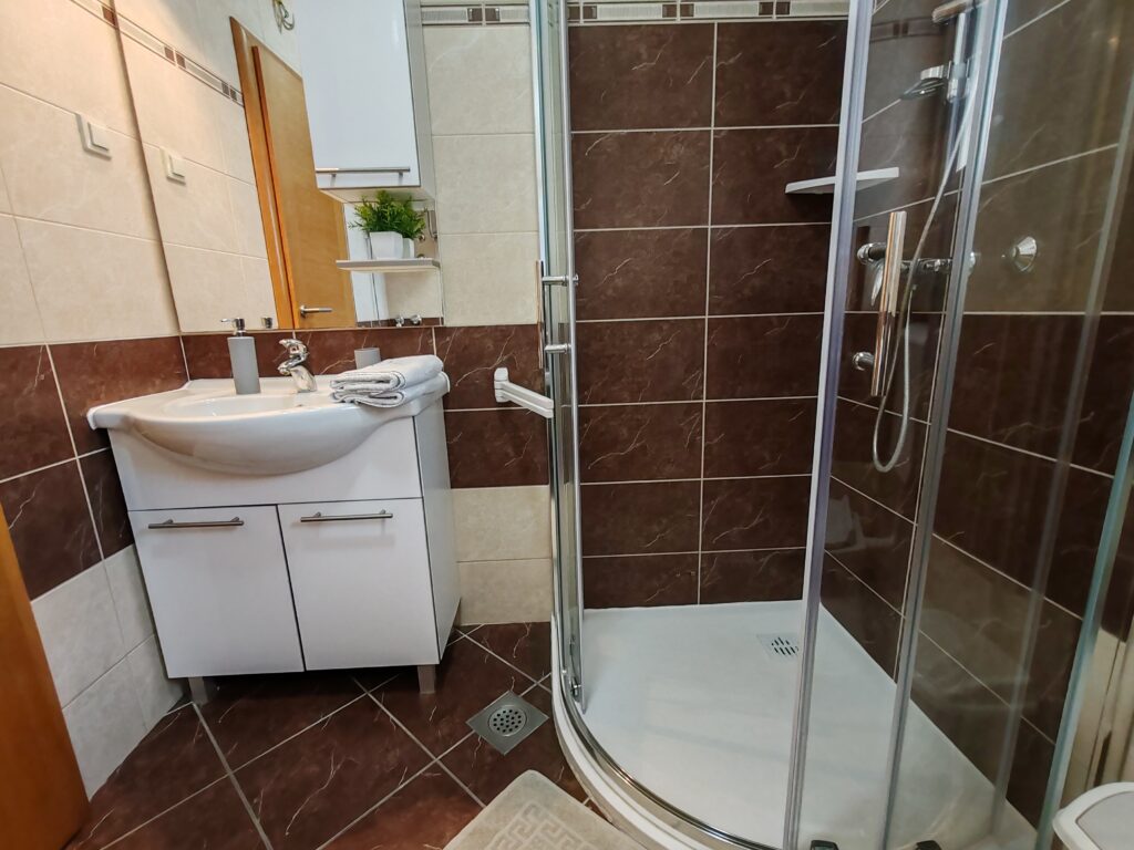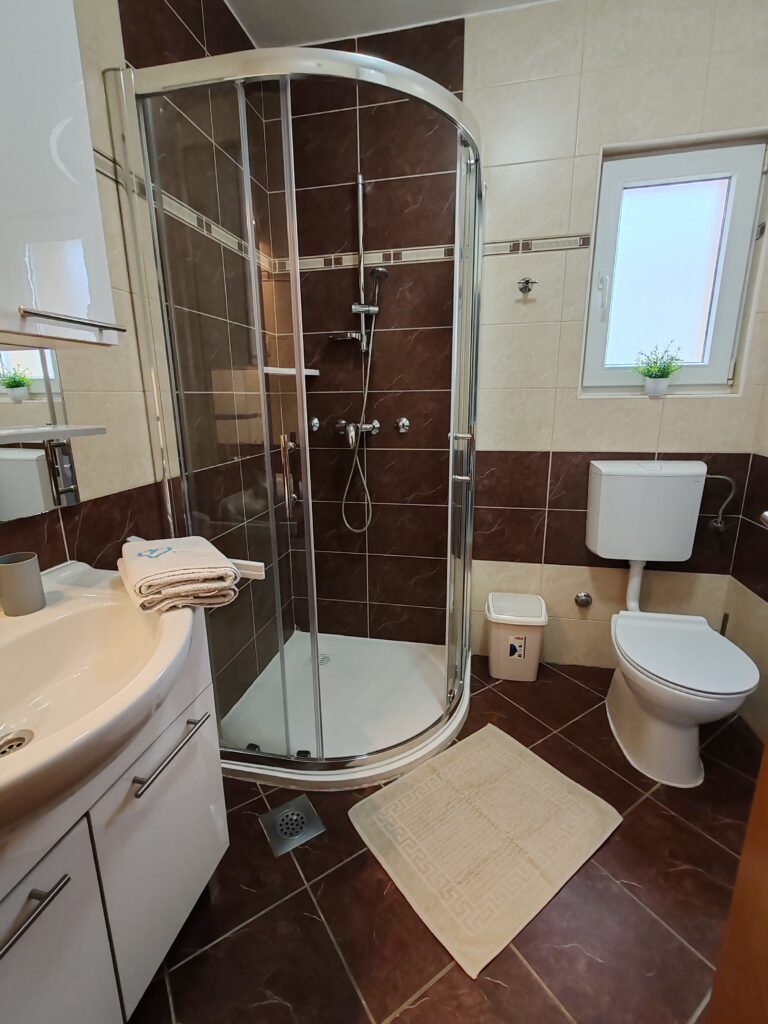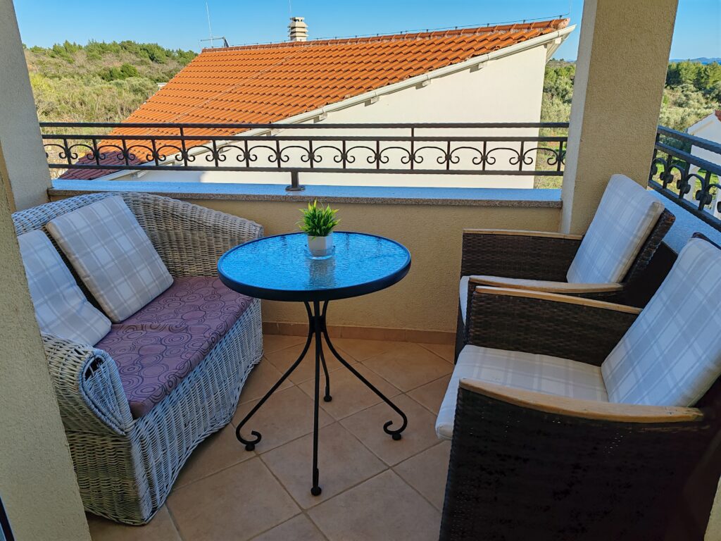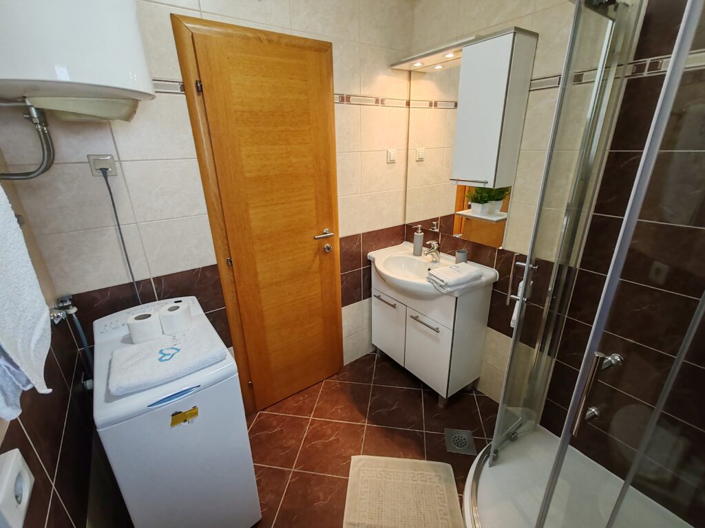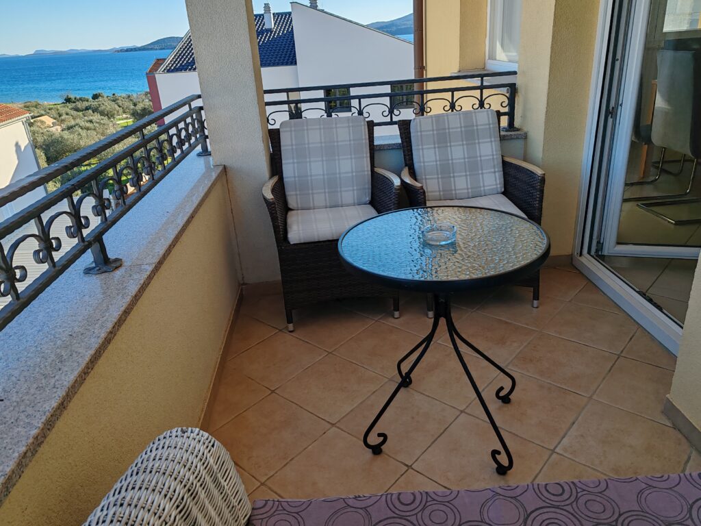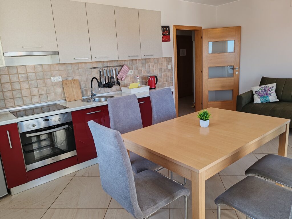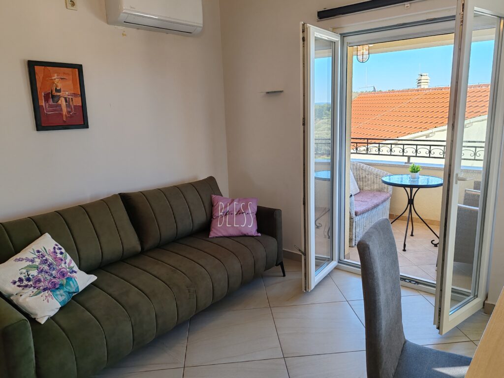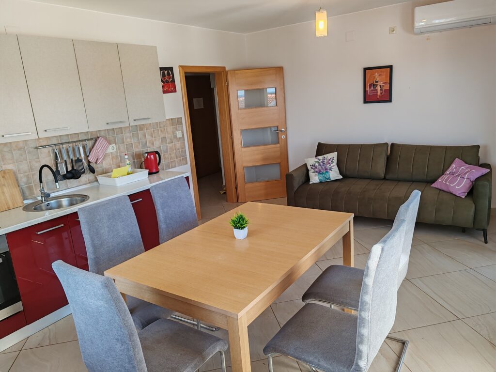Located on the first floor ( south) . Sizes 60 m2 and a terrace overlooking the sea.Consists of two separate rooms , one with a double bed and the other with two single beds.In kitchen there is a sofa bed / springbed.